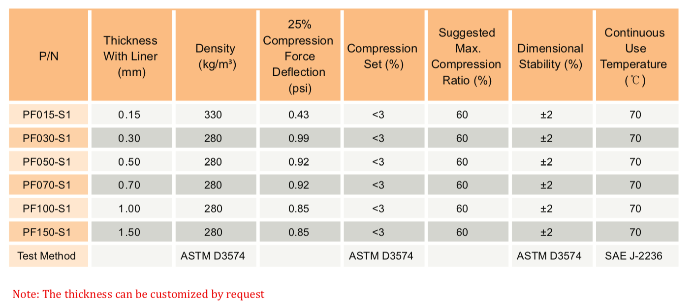 PolyplateTMPF-S1 系列是一種超柔軟、緩慢回彈的泡棉,用于電子設備的緩沖、保護性密封和長期間隙填充。可以達到60%的壓縮比。S1系列泡棉具有極低的壓縮永久變形、高密封性能和優異的沖擊吸收性能。