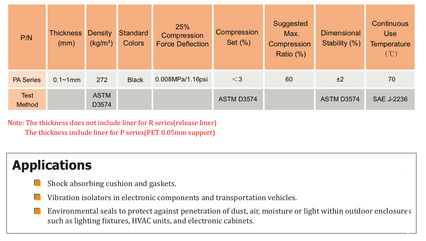 TM 丙烯酸泡棉 PA 系列特別柔軟,可提供超薄到中等厚度。PA系列具有良好的自粘合能力、低壓縮永久變形率、優(yōu)異的沖擊吸收和抗振動(dòng)性。" />
