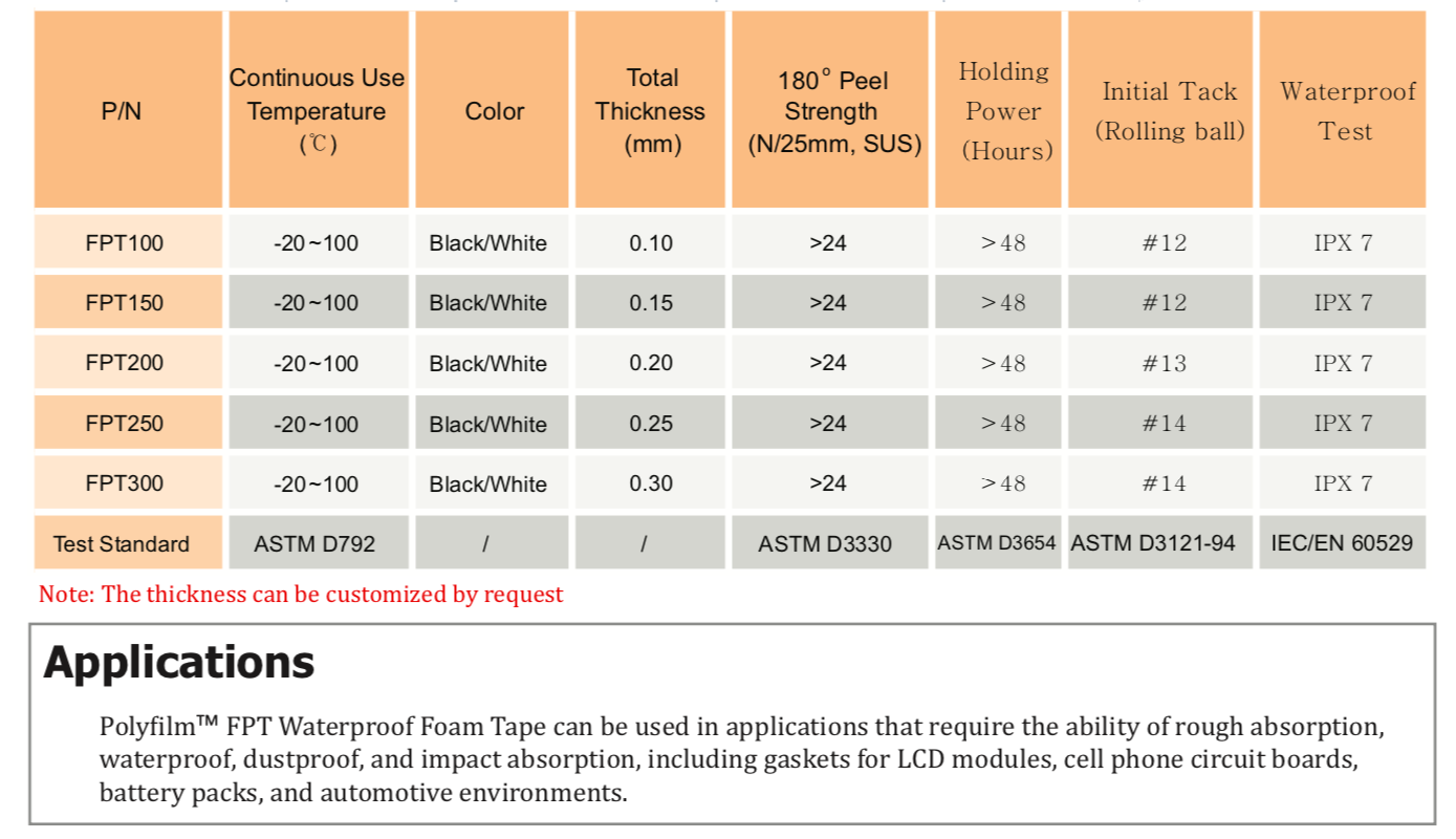 TM FPT 系列泡棉膠帶是一種雙面膠帶,由特定的聚乙烯泡棉和丙烯酸粘合劑組成。這種防水泡棉膠帶由于其微觀和獨立的細胞結構而非常薄和柔軟。它具有高的沖擊吸收能力、出色的防水性能和回彈性。" />